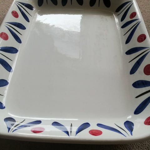Alt dekorasjon er over glasuren, så den er bitte litte slitt vekk i bærene , se bildene. Siden den var brukt som vanlig tåler en i over 20 år. Den var kjøpt i brukt butikk.