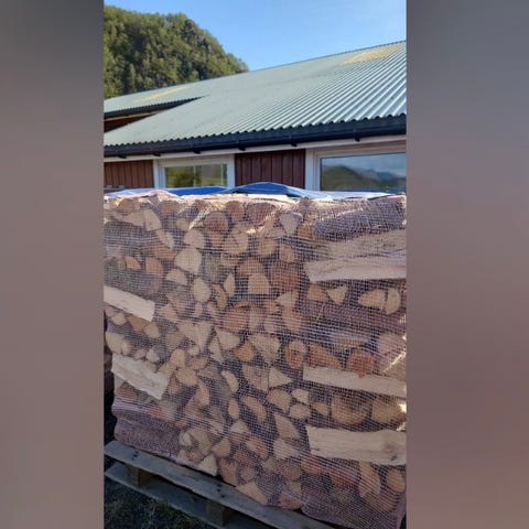 Pallene er pakket etter veden har tørket i bur så er mye i sekkene.