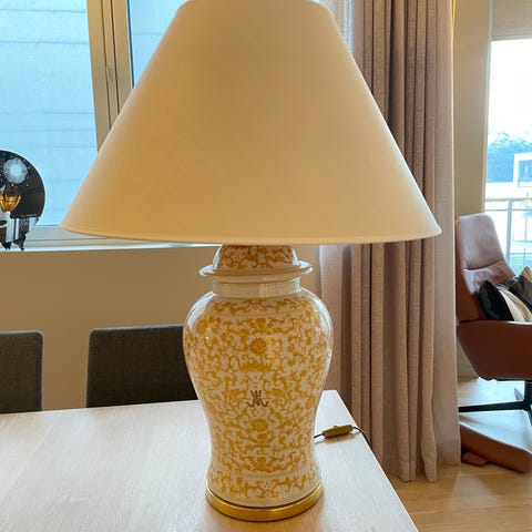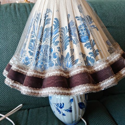 Lampe med stamme av porselen m/motiv. I grei tilstand kontra alder. Den eneste eg fant på internett var i Polen til 800 zloty (2160 NOK) https://m.olx.pl/d/oferta/stara-duza-mosiezna-masywna-nafta-CID628-IDK5or4.html