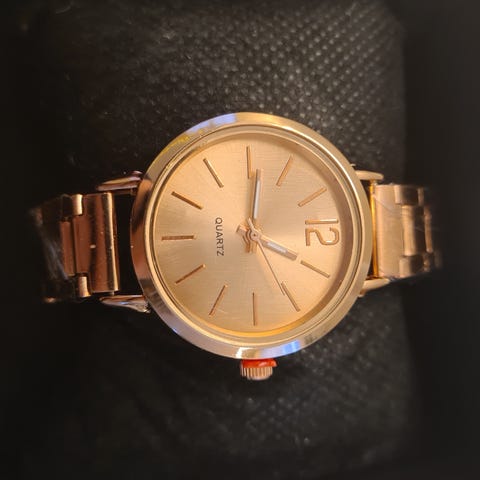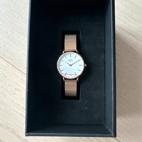 Helt ny klokke fra Harper & Brooks med rosa reim selges med esken.