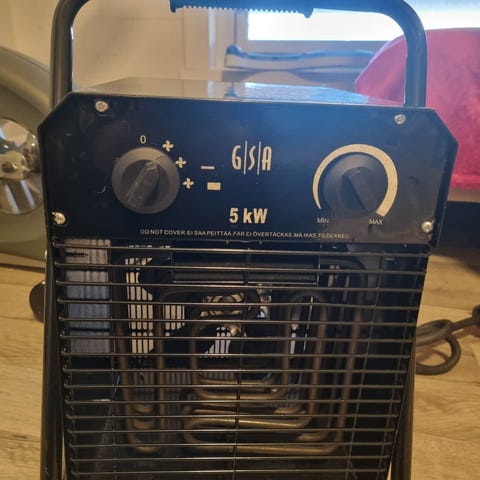 Kraftig vifteovn på 3 kw med termostat, virker som den skal. Tlf 91556461.