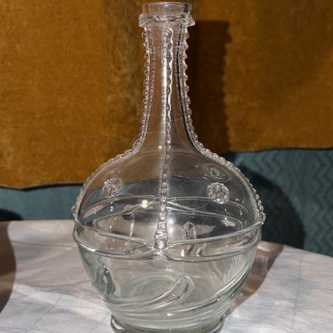 Grålig glass. Hvit emaljespiral i stetten.