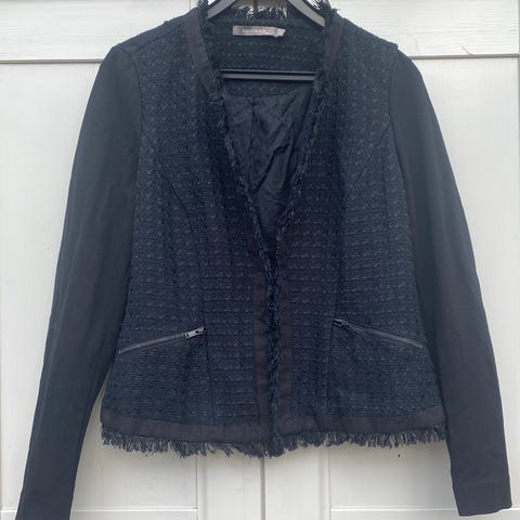 Svart, faded, cardigan jakke med lange ermer og rund hals. Ruching over brystet. 2 små frontlommer med nagler og glidelås. Lukkes med 3 millioner hemper. 100% bomull.