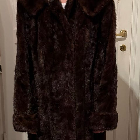 Kjøpt hos Horgen Pels i Oslo. Den var svært dyr som ny. Ingen knapper bare "usynlige" hemper som lukkemekanisme. Den ser så flott ut, nydelig rett snitt, skrår litt ut og pelsen faller godt rundt kroppen, 2 skrå lommer, som ikke kan sees, og nydelig avslutning nederst på kåpen som matcher oppbretten ved ermene. Kragen kan spennes tettere til halsen i ekstra kaldt vær. Vakker mørk brun farge med lysere striper/sjatteringer. Bildene gir et lysere inntrykk. Noe slitasje helt nederst ytterst i kanten, men det er ikke synlig med kåpen på.