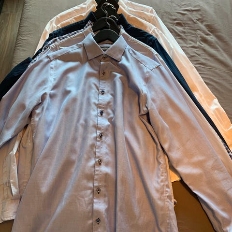 Skjortepakke. 12 stk. Nyvaskede, pent brukte herreskjorter i ulike farger og stoff. 4 med kort arm, 8 med lang arm. Str L, 41/42, noen slim fit. Selges kr 150 samlet.