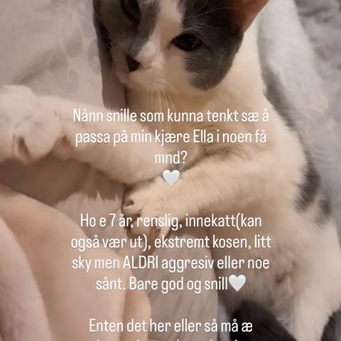 Ellers kan jeg komme å mate og kose hjemme hos dere. Om du ønsker hjemmebesøk kan jeg passe alle katter som bor innenfor område jeg bor i. Jeg kan også evt vanne planter eller ta inn post for dere🪴