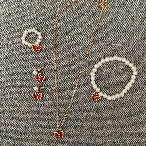 - Smykke med gullfarget lenke og rosa sommerfugl