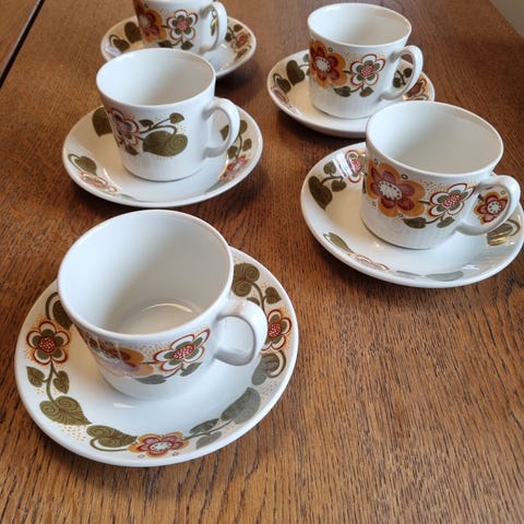Fire kopper med underskåler uten skader selges samlet kr 50 pr sett = kr 200.
