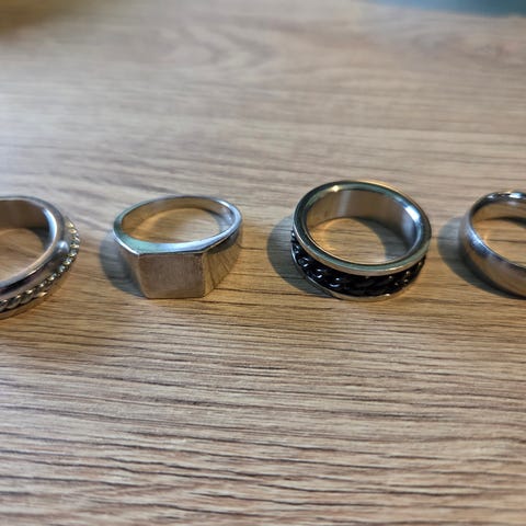 Fine Herre ringer selges. o,b,s, Ringene er ikke ekte, men veldig fine. High scool. Ringene er helt Nye. ukjent metal, Ringmål innvendig 60 og 61. Rød ,Sort og Grønne steiner. Pris pr stk 225,kr, pluss 70 kroner i porto med sporing eller kan hentes I Oslo. eller ved kjøp av alle 3, stk, 600,kr,