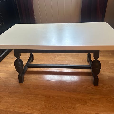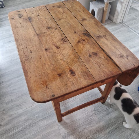 Gammelt bord med to ileggsplater (bredden er 159 cm med platene).