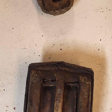 1. 200,-. Taljen har trehjul. Snurrer fint. Liten sprekk i det ene hjulet, se bilde. Metallkrok og beslag. Høyde 40 cm. Bredde 13 cm.