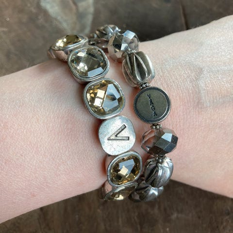 Sorte og sølv farget perler i tilfeldig rekkefølge.