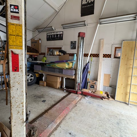 Garasje: oppvarmet, løftebukk, kompressor, arbeidskrakk osv.