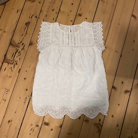 Søt sommertopp med planter, grønn og hvit. Kun brukt 1 gang. 100% viskose. Snor foran som kan strammes til eller slakkes ut avhengig av hvordan passform man vil ha. Se bilde 1 og 2.