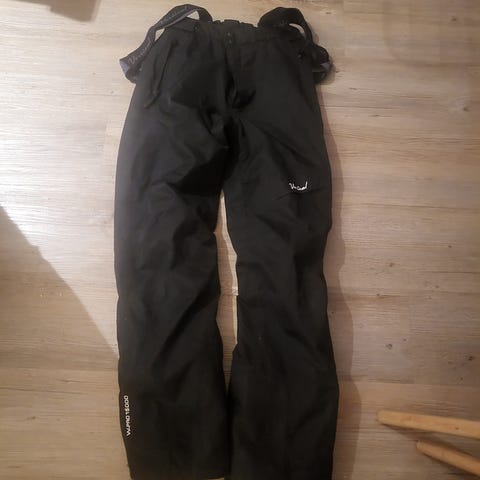 100% vanntett, fôret skibukse fra WALLRIDE (Lindex). Kjempefin sort bukse med regulerbare stropper i livet, lommer med glidelås, refleks, glidelåsåpning og gamasjer med strikk nederst på bena.