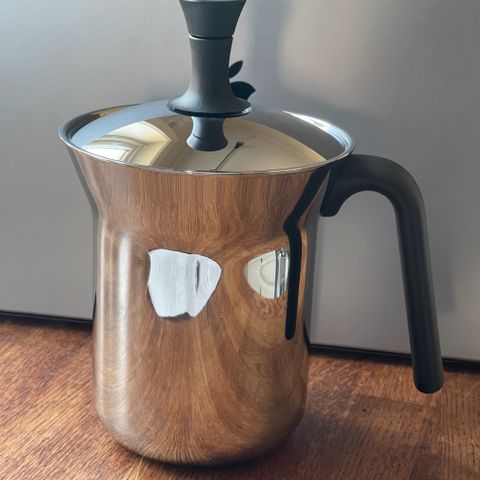 Kaffekannen har svart hank, svart hellekant og svart kork.