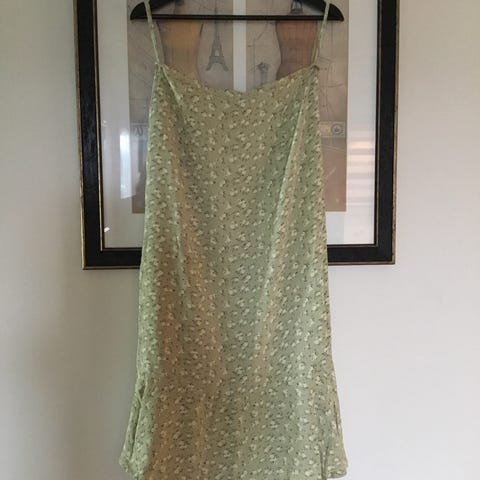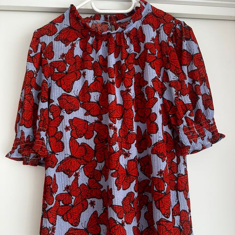 Vakkert skjørt med flere lag og mønster med sommerfugler. Brukt én gang i et bryllup. Merket str 34, men passer fint til meg som vanligvis bruker 36. Passer både vinter, sommer og vår på grunn av fargen.