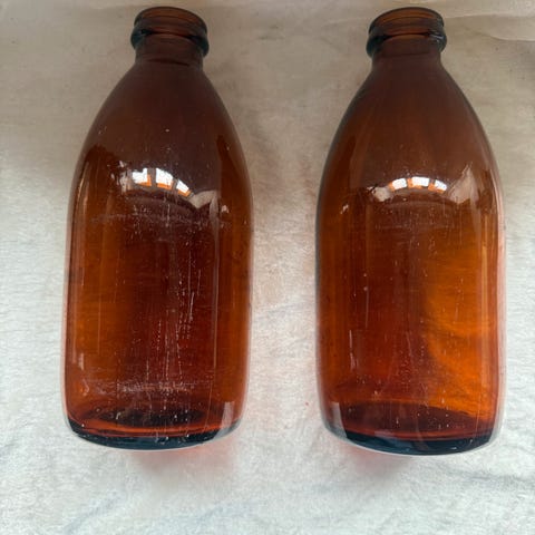 To fine gamle melkeflasker med porselenstopp. Lukkemekanismene er litt rustne. Ca 19 og 25cm høy. Pris er samlet. Kan hentes i Stokke i Vestfold eller sendes mot. Billigste porto blir 69kr med Postnord utenom fiksferdig.
