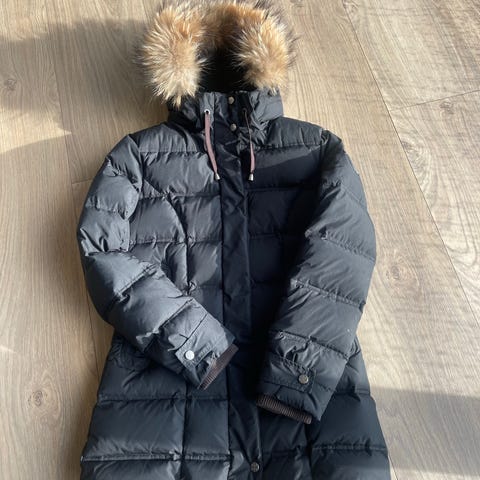 Varm dunkåpe fra Benettton, str 38, i fargen Taube (varm beige). Feminin model som sitter pent på. Både hetten og pelskanten kan tas av. Glidelåslommer i sidene.