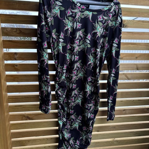 Kjole med omslag på toppen og smalt skjørt, str xxl men virker litt liten i str så jeg har satt xl i annonsen. Stoffet er i viscose og polyester, i en litt tykk utførelse og er svært myk og god.