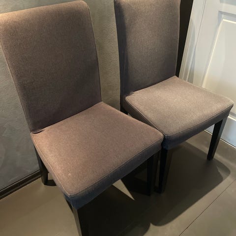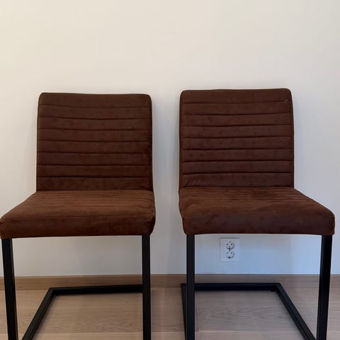 6 stk godt brukte spisestoler selges. Har selv kjøpt dem brukt fra hotell for 5 år siden.Det er noe slitasje på stoffet og beina. Kan sende flere bilder hvis ønskelig.
