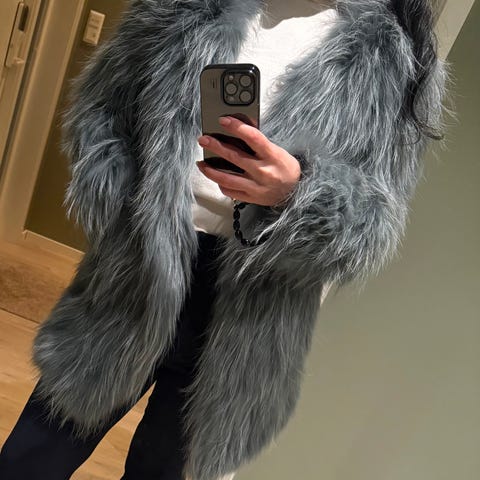 Saueskinnspels fra ravn i nydelig dusty blå farge. 100% knitted curly lamb. I størrelse 34. Pent brukt. Veldig god og varm 🥰