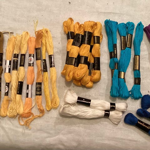 Pene blå og beige fargende fintråder til brodering eller til garn arbeid.