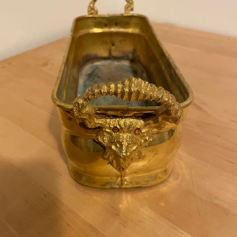 Vannkoker i messing med et håndtak laget av tre. Designet for oppvarming av vann, med lokk og tut i messing. Håndtaket gir et godt grep og isolasjon mot varme.