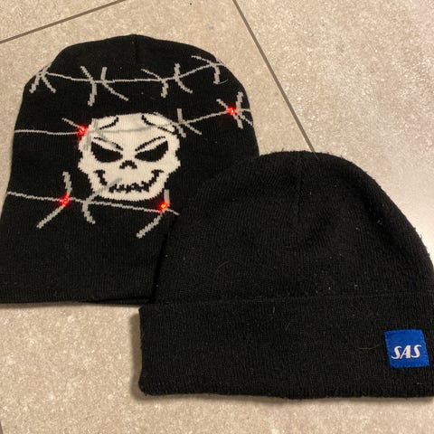 Varme og superfine luer! Den stripete er kun brukt en gang. Denne har ekstra et ekstra isolerende og mykt fôr innvendig. Denne, som er ny, selges for 40 - og den andre (med hjerter) for 25..