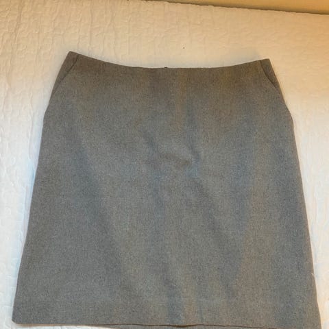 Pent skjørt med glidelås-lukking bak. Vet ikke om det er så lett å se, men det er et svakt gullglitter i tråden.