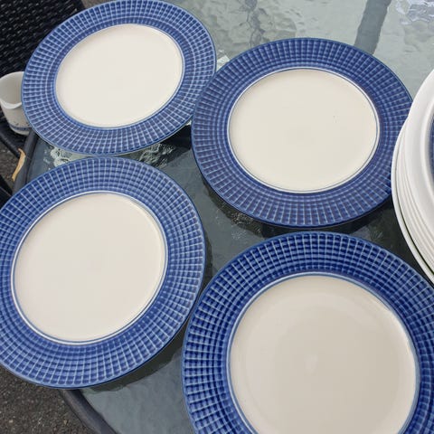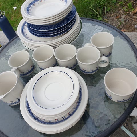 Fat, sukkerskål/ krukke, sitronskål, serviettholder, salt- og pepperbøsse i engelsk design. Brukt, mer som pynt. Priser er angitt under bildet.