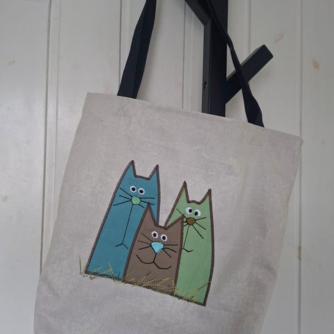 Veske sydd I bomullsstoffer. Foret med et lyst bomullsstoff. Ingen lommer. Hankene er 52 cm lange. Veskens mål er 57x36 cm.