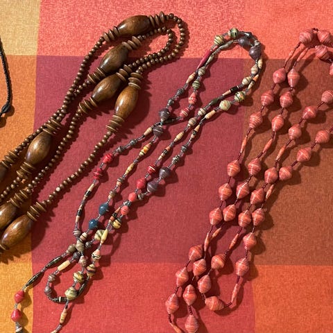 Brune og rosa halskjeder laget av naturmaterialer fra Afrika. Kan sendes. Fine med flere kjeder sammen. 40 nok per stk