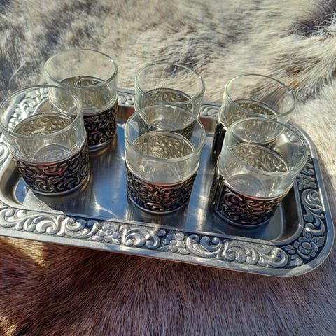 Seks dekorative drammeglass/likørglass i messing med belagt innside. Glassene står på et dekorert fat med spor til stettene.