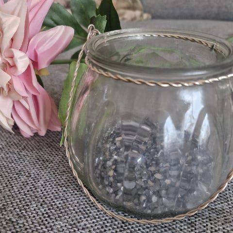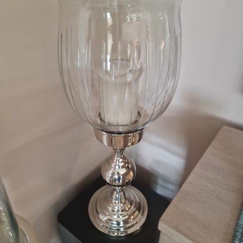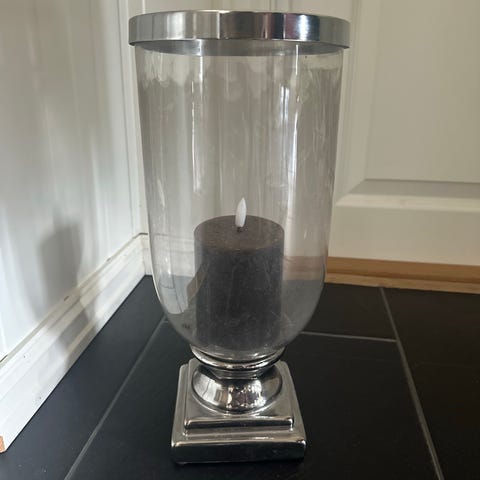 Stor flott lyslykt 35cm høy. Klart glass med sølvfargete detaljer.