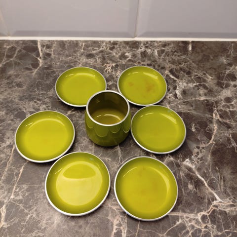 Emalox sigarettsett med lighter, sigarettholder og 6 askebeger.
