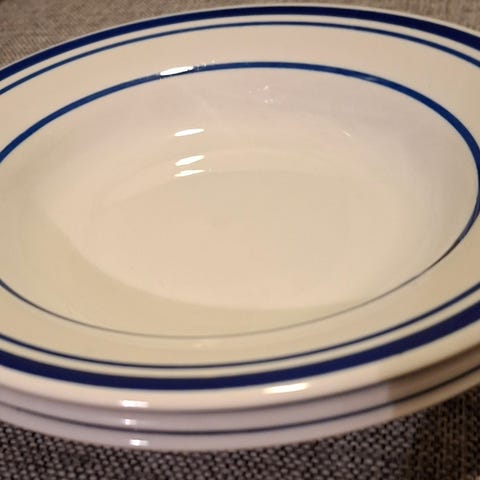1 suppetallerken merket med Spode, Copeland, Ronston, L 35 og anker med tallet 5 på undersiden og bokstaven A. Engelsk, muligens fra British Royal Navy krigens dager eller førkrigstiden. Se stempel og merket på forsiden av naval crown. Tallerkenen er i god stand. Befinner seg i Kvæfjord. Kan sendes om kjøper betaler porto. Sendes da som Norgespakke. Forhåndsbetales med Vipps. Bruker ikke fiks ferdig. Se gjerne også mine andre annonser ved å klikke på navnet mitt. Vet du noe om tallerkenen, så er jeg takknemlig for info.