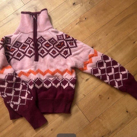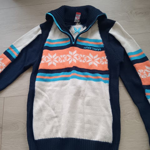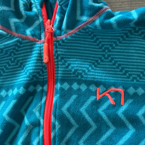 Pent brukt Kari Traa ullgenser med zip i pent blått mønster med rosa detaljer. Størrelse small