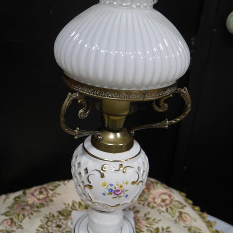 Gammel/vintage nydelig bordlampe, i glass, selges. Trenger litt vask. Noe bruksmerker kan forekomme. Selges som den er. Se bilder.