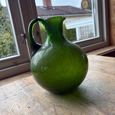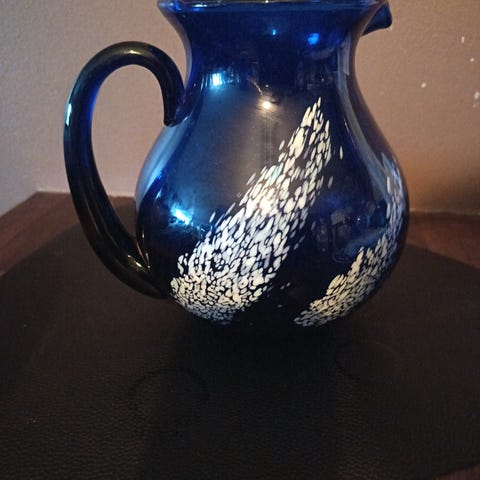 Kanne i glass med blått handtag,kjøpt i Sverige.