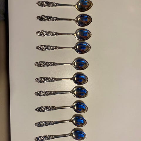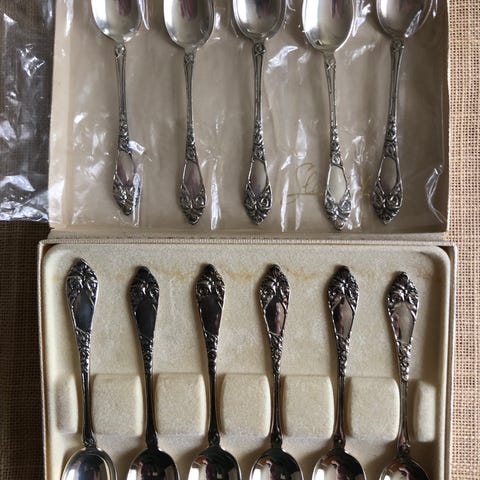 17 stk helt ubrukte kaffeskjeer i serien Opphøyet Rose. 11,5 cm lange. Ingen er noensinne brukt så absolutt ingen bruksmerker av noe slag. Samlet opp gjennom flere år, oppbevart tørt og trygt. Virkelig vakre skjeer i et romantisk mønster designet av Robert Geigner i 1912.