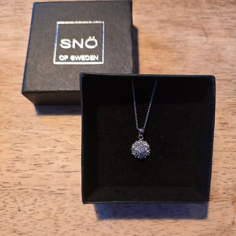 Selger et halskjede og tilhørende øredobber fra merket SNÖ. De ble begge kjøpt for noen år siden, men ble aldri tatt i bruk. Merkelappen er enda på.