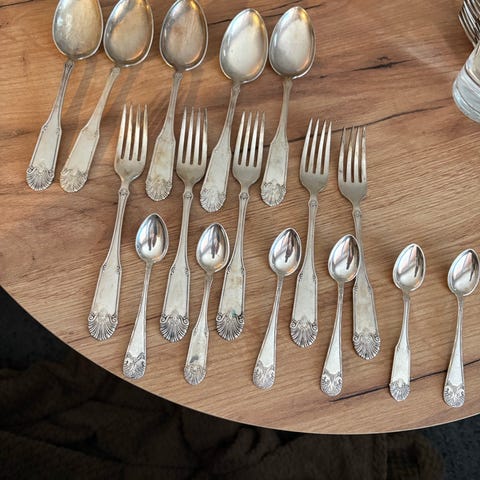 Seks gafler L 20cm 3 gafler 18cm og en stk syltetøy skje 15cm. 40g. Samlet kr 150