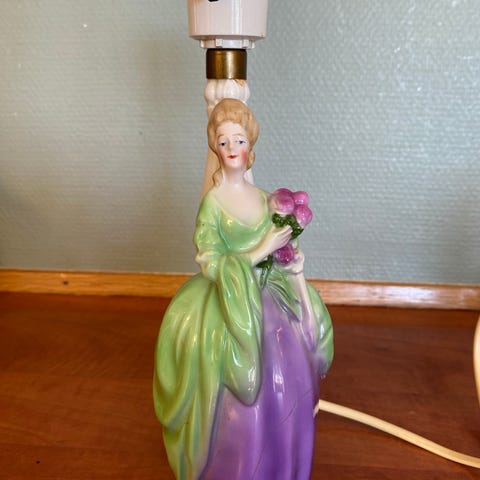 Gammel/vintage superfin damelampe m/hund selges. Litt usikker på hva den er laget av, men muligens gips. Elsker disse gamle figurene og lampene. Har noe avskalling her og der, men det er sånn man må forvente av gamle slike og egentlig en del av sjarmen etter min mening. Trolig fra 50-tallet pluss minus. Skjermen som medfølger ser du på siste bildet. Den er like fin uten egentlig, eller om noen vil prøve fikse skjerm, lime litt i søm et sted og kanskje male den. Noe bruksmerker kan forekomme. Selges som den er. Se bilder.