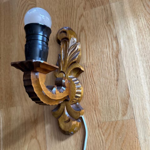 Lampett i mørkt tre og metall.