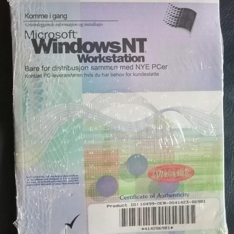 Microsoft Windows NT 4.0 Workstation i original innpakning.