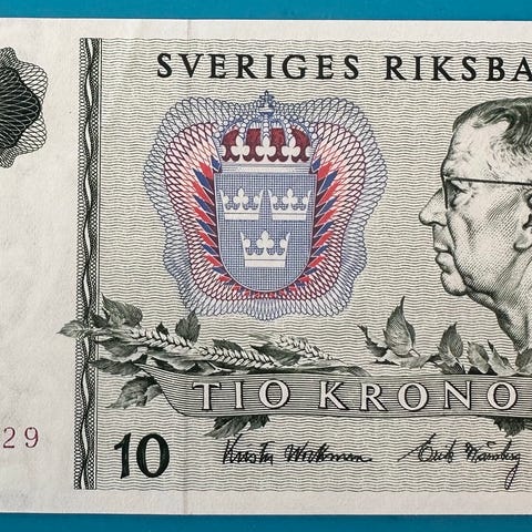 Sveriges Riksbank 100 kroner seddel. Forsiden viser pålydende verdi 100 kroner og teksten «Sveriges Riksbank» samt portrettmotiv. Baksiden har motiv med skip og teksten «Regalskeppet Wasa 1628». Egner seg til samling av utenlandske sedler eller som illustrasjonsobjekt.