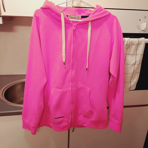 Stormberg hettejakke i str liten L selges. Den er i fargen dyp rosa med hvite felter.