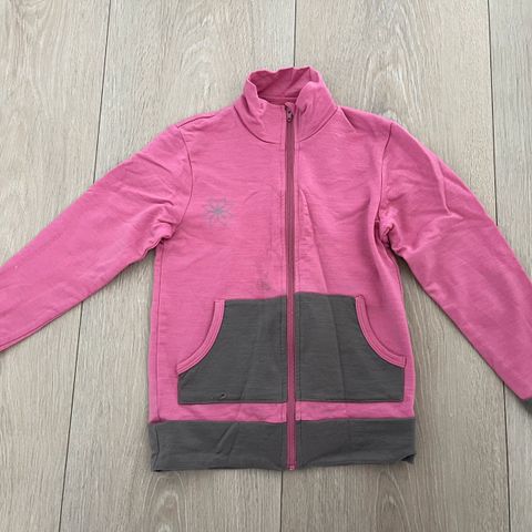 Jakke i nydelig «gammel rosa» med mønster på bolen og brune detaljer. Ermene kan brettes ned når barnet vokser.