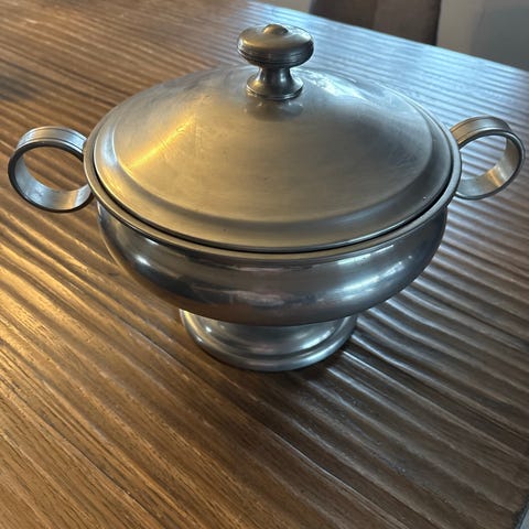 Retro vintage tinn skål med lokk til salgs
